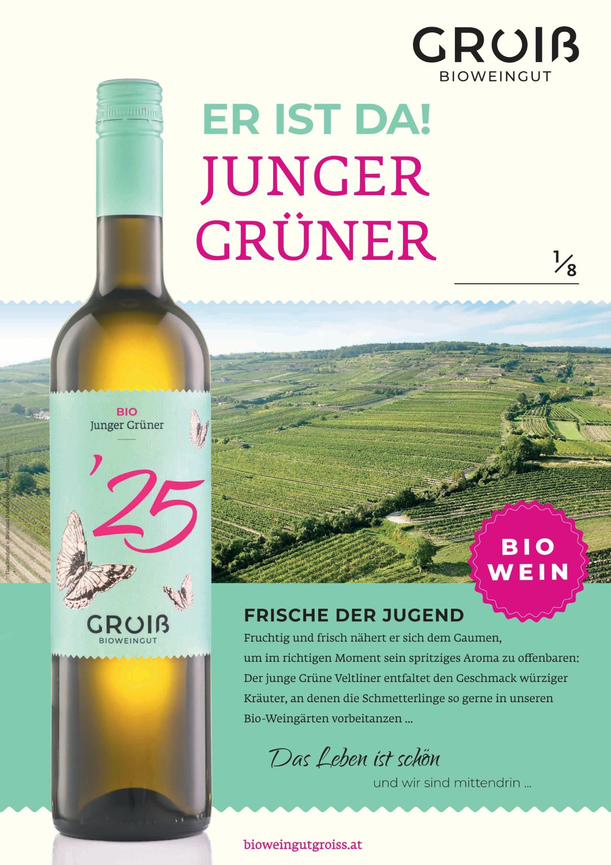 ... ähnlich den Schmetterlingen, die an den Veltliner Reben vorbeitänzeln - leicht und jugendlich so schmeckt auch unser Junger Grüner vom Jahrgang 2021. Lasst uns auf das Leben anstoßen!